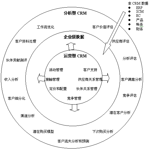 能提供上述問題和其他企業(yè)問題的客戶信息,就能夠?qū)蛻舴⻊?wù)、銷售技巧和隨后的促銷戰(zhàn)略作出關(guān)鍵決策。通過對(duì)“運(yùn)營型”CRM數(shù)據(jù)與來自于全公司的信息進(jìn)行集成,公司便能夠開始執(zhí)行分析型CRM;并且執(zhí)行后,可以作出真正的“以客戶為中心”的企業(yè)決策。