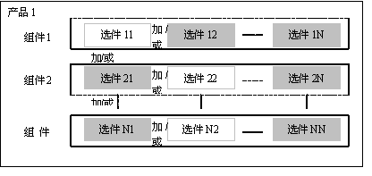 產(chǎn)品是由多個(gè)組件組成的,而組件則由多個(gè)選件組成。組件可以是有形的(如電腦硬盤)也可以是無(wú)形的(如保修期),產(chǎn)品,組件與選件的關(guān)系可以由圖6、2、2來說明。