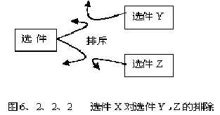選件的排除關(guān)系是指在產(chǎn)品配置時(shí),選擇了一件就不能選擇另外一件或多件。比如在旅行社在組團(tuán)時(shí)規(guī)定,如選擇了酒店A,就無(wú)法選擇組件交通工具中的選件火車,因?yàn)榫频闍離火車站太遠(yuǎn)。圖6、2、2、2說明了這種關(guān)系。