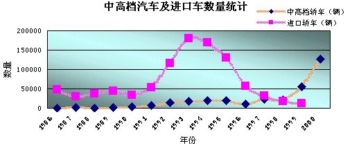 第三階段:1999年以后的快速增長階段。1999年中高檔汽車產(chǎn)銷量結(jié)束了六年的徘徊局面,首次突破5萬輛,比上年增長了1.5倍,在轎車市場中的占有率升到9.7%。2000年中高檔汽車的產(chǎn)量又實現(xiàn)翻倍,增長率為232.46%,年產(chǎn)量達到127,676臺。進口中高檔汽車數(shù)量也超過了3萬臺,僅日本車的進口量就達23,502臺。