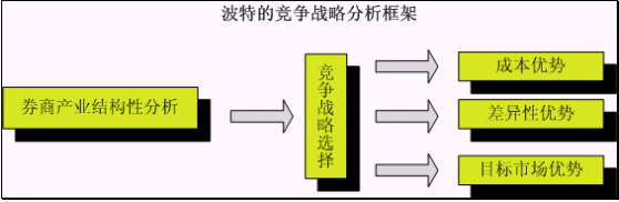 上圖為利用哈佛著名教授邁克爾o波特的競(jìng)爭(zhēng)戰(zhàn)略分析框架來分析證券營(yíng)業(yè)部的競(jìng)爭(zhēng)戰(zhàn)略。由于此文的著眼點(diǎn)是以證券營(yíng)業(yè)部為中心的產(chǎn)業(yè),也就是證券公司的經(jīng)紀(jì)業(yè)務(wù)產(chǎn)業(yè),而證券公司的其他金融服務(wù)項(xiàng)目如投資、自營(yíng)等業(yè)務(wù)不在本文討論的范疇。