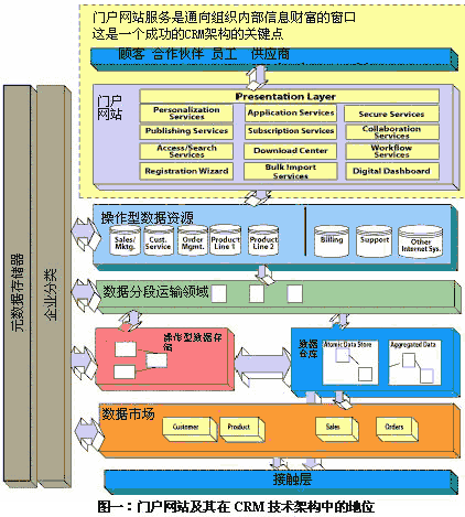 圖一向我們展示了一種CRM技術(shù)架構(gòu),它以Web門戶網(wǎng)站作為客戶、合作伙伴、員工和供應商之間的通路,并以此作為它的主要特征。