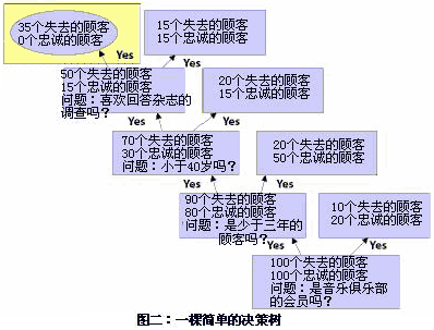 你可以從它的名字中猜到,決策數(shù)是一種樹型分析模型。樹枝代表了用來定義或者細分客戶的不同問題。比如,假設一家音樂俱樂部想要分析為什么一些會員不會再次申請它的會員資格(該俱樂部會員采取月申請制)。為了形成決策樹,公司召集了一批由100個忠誠顧客、100個非忠誠或者已經(jīng)公司已經(jīng)失去的顧客組成的測試小組。然后,公司開始提出一系列問題,要求顧客形容一下忠誠的顧客和非忠誠的顧客是什么樣子的。整個決策樹就如圖二所示。
