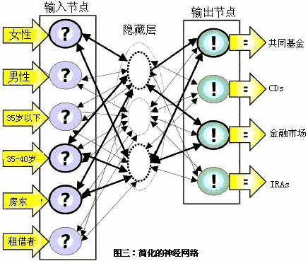 假設該集團的數(shù)據(jù)組包括了100000個現(xiàn)有和潛在的顧客。數(shù)據(jù)組中所有成員至少滿足一個列示于每個輸出節(jié)點邊上的特征條件,比如說,他們的年齡小于35歲或者是在35-40之間,男性或者女性,房東或者租借人。BPN從所有的輸入節(jié)點中獲得數(shù)據(jù),并且以此編譯一個預測型模型。這個簡單的模型告訴使用者,年齡在35-40歲之間的男性房東最有可能購買共同基金和金融市場產(chǎn)品。這是BNP能預測的信息。