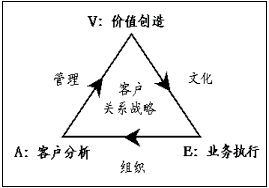 在全球CRM最佳實(shí)踐中有一種被稱作CRM"魔三角"的原理,備受企業(yè)的青睞。如下圖所示,構(gòu)成三角形三個(gè)頂點(diǎn)的,分別是"A"客戶分析、"V"價(jià)值創(chuàng)造和"E"業(yè)務(wù)執(zhí)行,它們反映客戶關(guān)系管理的全部?jī)?nèi)容;構(gòu)成三角形三條邊的分別是"AV"管理、"VE"文化和"EA"組織,它們代表與客戶關(guān)系管理內(nèi)容相適應(yīng)的運(yùn)營(yíng)環(huán)境及其方法。