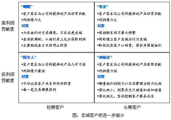 CRM廠商和業(yè)界普遍認(rèn)為:只要贏得了客戶的忠誠,企業(yè)將"財(cái)源滾滾";因此企業(yè)在培養(yǎng)客戶忠誠方面的開支在逐步上升。因?yàn)閺谋砻嫔峡磥,客戶滿意度、客戶忠誠度和客戶保留度越高,客戶利潤貢獻(xiàn)度就大。但事實(shí)并不如他們所愿,《哈佛商業(yè)評(píng)論》最新的論文,研究表明:客戶滿意度、客戶忠誠度與客戶利潤貢獻(xiàn)度的關(guān)聯(lián)程度比預(yù)期的要小得多。企業(yè)應(yīng)當(dāng)對(duì)忠誠客戶再進(jìn)行細(xì)分,然后在更細(xì)化的客戶基礎(chǔ)上對(duì)其進(jìn)行分類管理,并采取相應(yīng)的對(duì)策。在論文中,作者根據(jù)利潤貢獻(xiàn)度大小與客戶的短長期兩個(gè)維度,將忠誠客戶進(jìn)行了深層次細(xì)分。主要分成四類:"蝴蝶"、"摯友"、"陌生人"、"神秘者"。企業(yè)應(yīng)該根據(jù)每一類的情況采取相應(yīng)的對(duì)策。管理那些能使企業(yè)盈利但不忠誠的客戶--"蝴蝶"--的關(guān)鍵是,在他們購物時(shí)盡可能地從他們身上獲利。對(duì)那些既能帶來利潤又忠誠的客戶--"摯友",細(xì)心呵護(hù)他們則更為恰當(dāng)。至于那些忠誠但不能帶來利潤的客戶--"藤壺",你需要做的是確定他們是否有增加消費(fèi)的潛力。最后,對(duì)于"陌生人"--那些既不忠誠又沒有利潤可賺的客戶,答案當(dāng)然很簡單:早點(diǎn)認(rèn)出他們,不對(duì)他們做任何投資。