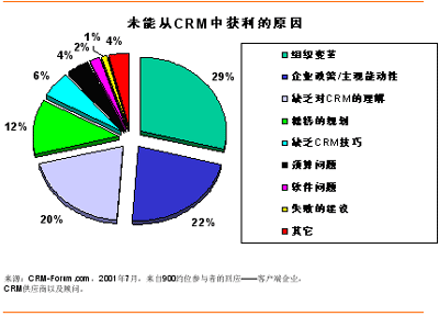 組織變革與企業(yè)政策/ 主觀能動性獨占50%以上的失敗原因。由于CRM是一項企業(yè)策略而不是營銷策略,因此它將不可避免地撼動整個企業(yè)——從人事到營運再到財政,而決不僅僅局限于銷售和營銷。