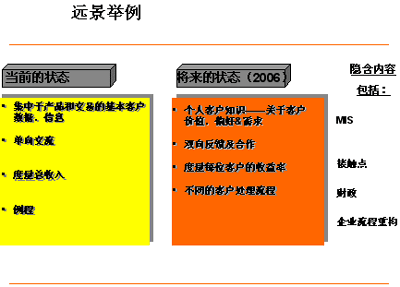 在評估當(dāng)前情況與遠(yuǎn)景,資源需求,癥結(jié),極限以及鋪就路標(biāo)和里程碑的關(guān)系時,實施展望和差距分析會議是十分重要的。取決于你對CRM遠(yuǎn)景的定義——無論是它將成為一個能夠給你一把競爭利刃的企業(yè)策略 (類似的例子有Citicorp,Dell,F(xiàn)ord Motors) 或僅僅只是一個讓你更出眾的營銷項目——這邁出的第一步在你選擇CRM方法論的過程中都必將起到舉足輕重的作用。一個核心的方法論必須能夠支持企業(yè)大部分的業(yè)務(wù)和流程需求,如MIS;客戶體驗管理;接觸點管理;收益率管理等等。