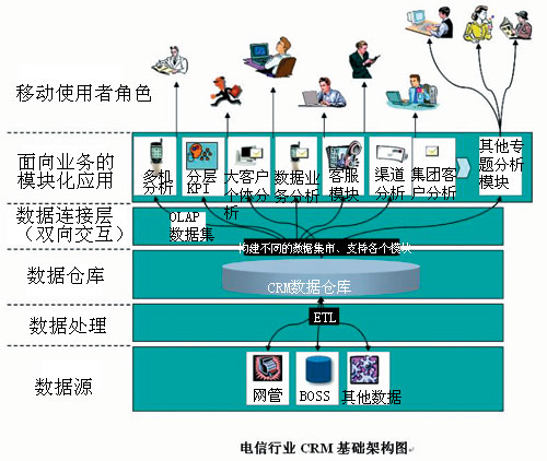 電信行業(yè)早期的CRM系統(tǒng)主要是由單一的多維分析子系統(tǒng)組成,比如移動總公司最早的CRM系統(tǒng)就僅僅規(guī)范了以多維分析為標準的九大主題分析。隨著移動電信市場的迅速增長,復雜程度越來越高,更多的子系統(tǒng)被添加進來,IT系統(tǒng)建設(shè)中模塊化的思路通過數(shù)據(jù)集市的方式在CRM建設(shè)中體現(xiàn)明顯。