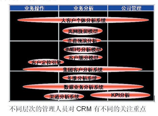 CRM系統(tǒng)自身的特點決定其不產(chǎn)生原始數(shù)據(jù),只是對其他相關(guān)系統(tǒng)所傳遞過來的數(shù)據(jù)進行數(shù)據(jù)抽取到展現(xiàn),所以CRM系統(tǒng)允許一定的數(shù)據(jù)誤差和延遲。但是在實際的建設(shè)和應(yīng)用過程中,廠家和運營商都發(fā)現(xiàn)數(shù)據(jù)的準確性和及時性是CRM系統(tǒng)應(yīng)用的最大瓶徑。同時早期參照國際標準建立的CRM系統(tǒng)根本不符合國內(nèi)應(yīng)用的要求,于是才逐漸發(fā)展出現(xiàn)了A-CRM(操作型CRM)和O-CRM(運營型CRM)之分,用以滿足不同層次人員對CRM系統(tǒng)的應(yīng)用要求。