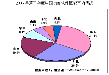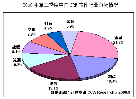 計世資訊(CCW Research)數(shù)據(jù)顯示,2006年二季度中國CRM軟件市場規(guī)模達2.25億元人民幣,比去年同期增長20.1%,其中通用型CRM軟件市場規(guī)模為0.80億元,占總體CRM市場份額的35.5%。