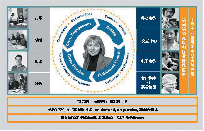 mySAP CRM不僅包含了企業(yè)市場(chǎng)營(yíng)銷(xiāo)、銷(xiāo)售、服務(wù)、分析等功能,還通過(guò)渠道伙伴、現(xiàn)場(chǎng)和移動(dòng)商務(wù)、交互中心、電子商務(wù)等各種交互渠道形成完整的閉環(huán)式設(shè)計(jì)的解決方案。在提供深入的行業(yè)應(yīng)用和傳統(tǒng)的部署方式的同時(shí),mySAP