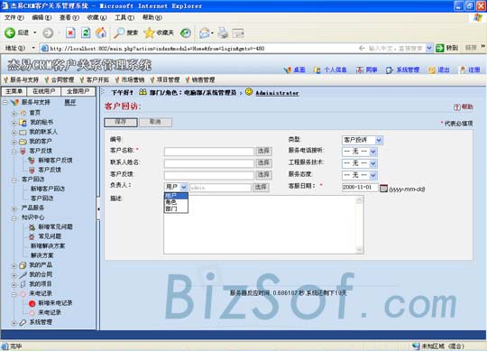 頁面的最頂端將本系統(tǒng)分為服務(wù)與支持、合同管理、客戶開拓、市場營銷、項(xiàng)目管理、銷售管理六板塊進(jìn)行陳列以方便管理,同時(shí)左側(cè)是詳細(xì)的樹形結(jié)構(gòu)圖,所有功能一目了然。本系統(tǒng)實(shí)現(xiàn)了將不同業(yè)務(wù)、客服人員涉及的客戶資料進(jìn)行了全面而且條理的整理匯集,整合團(tuán)隊(duì)的力量提供完善的服務(wù)。