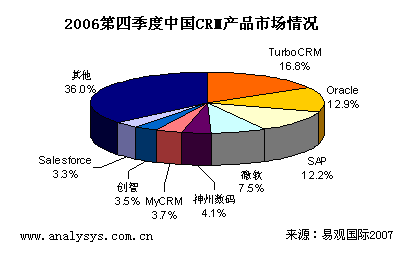 易觀(guān)國(guó)際研究表明,中國(guó)CRM產(chǎn)品市場(chǎng)2006年第4季度總體市場(chǎng)規(guī)模達(dá)到0.81億人民幣,季度增長(zhǎng)率達(dá)到4.2%,體現(xiàn)了穩(wěn)健增長(zhǎng)的趨勢(shì)。具體廠(chǎng)商方面,TurboCRM,Oracle(甲骨文),SAP位居領(lǐng)先地位。