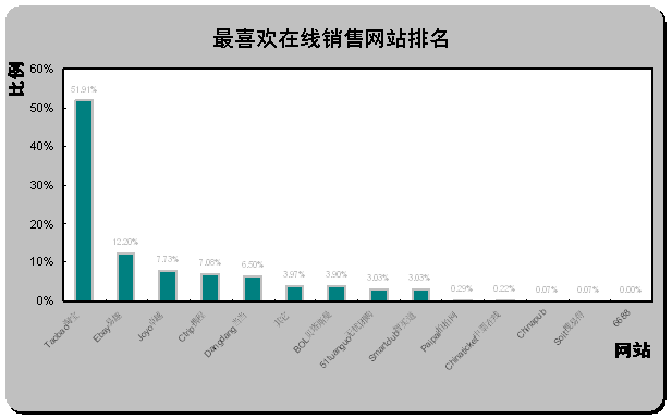 China和貝塔斯曼BOL成為“最不喜歡在線銷售網(wǎng)站”的前兩名,分別有19.77%和18.40%被調(diào)查者選擇易趣和貝塔斯曼作為“最不喜歡在線銷售網(wǎng)站”,兩家網(wǎng)站以相對較大的比例領(lǐng)先與其他各在線銷售網(wǎng)站。雖然淘寶以巨大的優(yōu)勢成為“最受歡迎的在線銷售網(wǎng)站”,但同時也可以發(fā)現(xiàn),仍有8.08%的被調(diào)查者選擇淘寶作為“最不喜歡在線銷售網(wǎng)站”,其它“最不喜歡在線銷售網(wǎng)站”比例相對較大的還有為當當(7.79%)。
