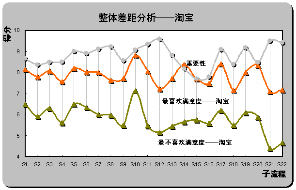 2) 體驗最優(yōu)流程。從滿意度曲線和重要性曲線的差距分析可以得出,在選擇其作為最喜歡在線銷售網(wǎng)站被調(diào)查者中,淘寶在S14(個人購買歷史回顧)流程上的滿意度高于重要性,在這個流程上,淘寶為用戶提供了非常優(yōu)越的在線體驗。