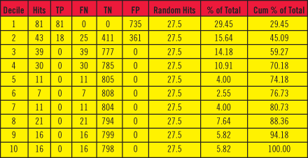 Decile-分組序號;Hits-命中數(shù),即每組內包含的實際響應數(shù),等于TP+FN;