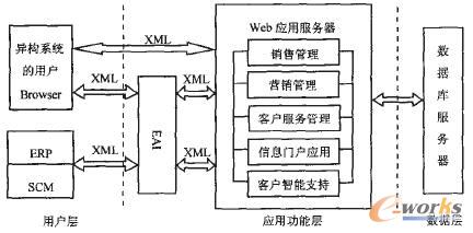 包括ERP、SCM等其他企業(yè)應用在內的所有的系統(tǒng)用戶與應用功能層的數(shù)據(jù)交換均通過XMI數(shù)據(jù)進行傳輸,從而大大減小了各種企業(yè)應用系統(tǒng)間的通信阻力,為EAI提供了良好的通信平臺。Web用戶的客戶端只是“瘦小的”瀏覽器日_數(shù)量不受限制,不需要安裝專門的軟件,這使得凡可以接入Internet的用戶都可以方便、靈活地使用系統(tǒng),大大提升了系統(tǒng)用戶間溝通、協(xié)作的效率。此外,由于CRM應用系統(tǒng)是在中央服務器上實施和維護的,對客戶端的要求遠沒有C/S結構那么高,集中的軟件實施和維護大大節(jié)約了企業(yè)的運行成本和維護費用。圖1描述的是筆者所要闡述的適應網(wǎng)絡環(huán)境的基于Web的系統(tǒng)平臺架構,這并不意味著CRM應用系統(tǒng)完全以這種方式運行,事實上用戶接入CRM系統(tǒng)的方式是多種多樣的,系統(tǒng)還應該提供電話、傳真、無線接入等多種接入接口。
