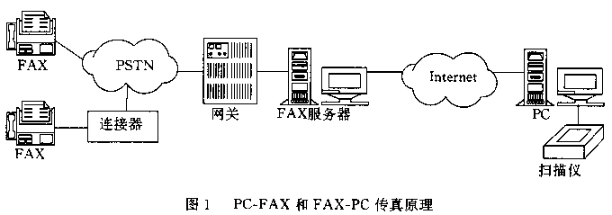 傳真機(jī)的基本工作原理是利用光電掃描技術(shù)將圖像、文字轉(zhuǎn)化為采用霍夫曼編碼方式的數(shù)字信號,經(jīng)V.27、V.29方式調(diào)制后,按T.30協(xié)議在模擬信道上傳輸。由于通信協(xié)議、信號格式的不同,傳真機(jī)是不能直接在Internet網(wǎng)上傳送信息的。要使連接在PSTN上的傳真機(jī)發(fā)出的信號在Internet網(wǎng)上傳輸,基本的原理則是在PSTN和Internet之間構(gòu)筑網(wǎng)關(guān),由網(wǎng)關(guān)進(jìn)行協(xié)議的轉(zhuǎn)換,使PSTN網(wǎng)的傳真信號和Internet網(wǎng)的數(shù)據(jù)包可以相互轉(zhuǎn)換。