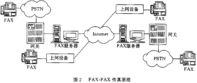 發(fā)送端傳真機(jī)與網(wǎng)關(guān)連接,通過PSTN傳送傳真,網(wǎng)關(guān)接收傳真后通過Internet傳至另一端的網(wǎng)關(guān),另一端的網(wǎng)關(guān)再通過PSTN將傳真發(fā)送給接收端傳真機(jī)。這種方式既適合存儲轉(zhuǎn)發(fā)模式,也適合實(shí)時模式,因此更加有吸引力。近年來,出現(xiàn)了一種不依賴網(wǎng)關(guān)的FAX-FAX IP傳真技術(shù),它是利用傳真機(jī)外掛一專用上網(wǎng)設(shè)備直接在Internet網(wǎng)上發(fā)送信息,原理如圖2所示。