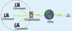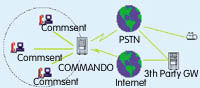 COMMANDO系統(tǒng)提供與其他同類系統(tǒng)之間的互連互通功能,通過選擇不同的模塊可以輕松實(shí)現(xiàn)與CISCO、CLARENT、COMMSENT、WHEREVER等VoIP系統(tǒng)之間的無縫銜接。