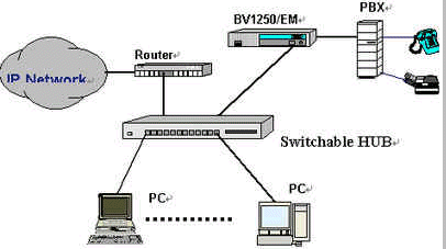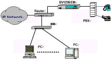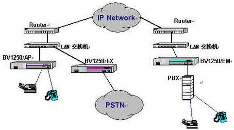OKI公司的IVG BV1250互聯(lián)網(wǎng)絡(luò)IP電話語音網(wǎng)關(guān)就是一種非常好的選擇,完全基于H.323 Ver2.0協(xié)議,實現(xiàn)語音和傳真在因特網(wǎng)上傳輸。使用BV1250 進行IP電話和IP FAX通信時,可以感覺到與傳統(tǒng)的電話或傳真所提供的服務(wù)毫無區(qū)別。運用BV1250,可通過互聯(lián)網(wǎng)(Internet/Intranet)將電話機、傳真機和PBX進行互連,建立專用的IP電話網(wǎng)絡(luò)。BV1250使用的是靜態(tài)IP地址,因此不能將BV1250連接到使用DHCP(動態(tài)主機通信規(guī)程)的互聯(lián)網(wǎng)上。常用連接方式如下圖所示: