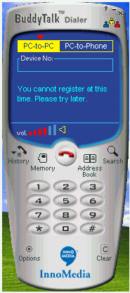 (如圖3),這個(gè)就是BuddyTalk的軟件界面。這象不象一個(gè)手機(jī)?上面的藍(lán)色部分是液晶屏。你可以選擇pc-to-pc或者pc-to-phone,下面是用來輸入電話號(hào)碼的一個(gè)空框,空框下面的部分是軟件顯示提示信息的,再下面是音量大小的顯示器。液晶屏的下面部分跟手機(jī)幾乎一樣,其中一個(gè)“search”,這是用來上網(wǎng)實(shí)現(xiàn)全球用戶數(shù)據(jù)庫搜索,一個(gè)“options”,各種設(shè)置可以在這里完成,“Memory”記錄的是你通話信息,以利快速撥號(hào)。