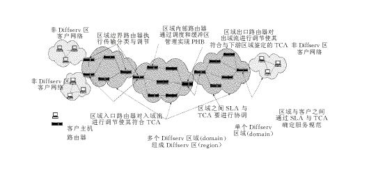 區(qū)分服務是由綜合服務(Int-serv )發(fā)展而來的,它采用了IETF的基于RSVP的服務分類標準,拋棄了分組流沿路節(jié)點上的資源預留。區(qū)分服務將會有效地取代跨越大范圍的RSVP的使用。區(qū)分服務區(qū)域的主要成員有:核心路由器、邊緣路由器、資源控制器(BB,Bandwidth Broker)。在區(qū)分服務中,網絡的邊緣設備對每個分組進行分類、標記DS域,用DS域來攜帶IP分組對服務的需求信息。在網絡的核心節(jié)點上,路由器根據分組頭上的DS碼點(Code Point)選擇碼點所對應的轉發(fā)處理。資源控制器BB配置了管理規(guī)則,為客戶分配資源,它可以通過服務級別協(xié)定SLA (Service Level Agreement)與客戶進行相互協(xié)調以分享規(guī)定的帶寬。