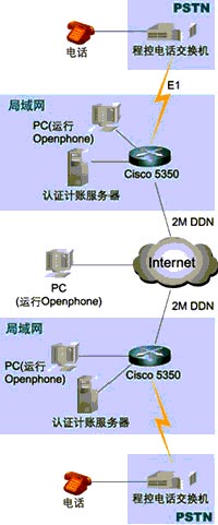 組成這個(gè)IP電話的網(wǎng)絡(luò)系統(tǒng)由處于兩個(gè)不同國家的區(qū)域組成(見附圖1網(wǎng)絡(luò)拓?fù)浣Y(jié)構(gòu)),每個(gè)區(qū)域都采用了一臺(tái)Cisco 5350路由器(以下簡(jiǎn)稱5350)作為網(wǎng)絡(luò)的核心,這臺(tái)5350路由器具有兩個(gè)WAN口和兩個(gè)以太網(wǎng)口,能夠直接連接到本地的局域網(wǎng)和DDN基帶調(diào)制解調(diào)器。和普通電話網(wǎng)絡(luò)(PSTN)相連接則是通過添加一個(gè)E1接口卡4PRI和一個(gè)IP語音數(shù)據(jù)處理單元NP60,來實(shí)現(xiàn)E1(30條ISDN的B信道)和路由器相連接,實(shí)時(shí)地對(duì)語音數(shù)據(jù)進(jìn)行H.323壓縮編碼。