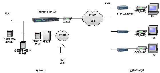 呼叫中心和代理之間傳輸可以選用寬帶高速ADSL網(wǎng)絡(luò),構(gòu)成以一個呼叫中心和眾多遠(yuǎn)端通信的綜合語音/數(shù)據(jù)VPN網(wǎng)絡(luò)。VoIP/Data ADSL VPN網(wǎng)絡(luò)是呼叫系統(tǒng)的解決辦法,它要求系統(tǒng)的性能好,穩(wěn)定性和可靠性高,語音質(zhì)量好, 響應(yīng)時間短,網(wǎng)絡(luò)配置和維護簡單方便。