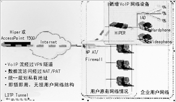 眾所周知,得到了廣泛的商用VoIP協(xié)議之一H.323功能強(qiáng)大,能根據(jù)網(wǎng)絡(luò)的狀況協(xié)商VoIP網(wǎng)關(guān)參數(shù)。但是,H.323協(xié)議的編碼的復(fù)雜性和端口的不確定性使得絕大部分NAT/PAT設(shè)備不能處理H.323。然而,基于HiPER的L2TP的VPN解決方案,不僅使話音在一個(gè)安全的網(wǎng)絡(luò)中運(yùn)行,還可以解決由于H.323協(xié)議復(fù)雜性帶來的NAT/PAT問題,在不用改造用戶現(xiàn)有的數(shù)據(jù)網(wǎng)絡(luò)的前提下,引進(jìn)了可以實(shí)際使用的VoIP服務(wù),保護(hù)了用戶的投資。