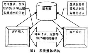 通過設(shè)置一個信令服務(wù)器的方式綜合以上兩種方式的優(yōu)缺點。用戶通話程序工作于半客戶機(jī)狀態(tài),信令服務(wù)器負(fù)責(zé)客戶的集中呼叫。當(dāng)某一個客戶呼叫,服務(wù)器負(fù)責(zé)中轉(zhuǎn)呼叫,當(dāng)被叫客戶響應(yīng)呼叫并應(yīng)答后,自主于呼叫方進(jìn)行通話而不必經(jīng)過信令服務(wù)器,這樣,大幅度地減少了服務(wù)器的數(shù)據(jù)量。有了集中的信令服務(wù)器,也便于客戶的管理,還可進(jìn)行廣播消息的發(fā)布。