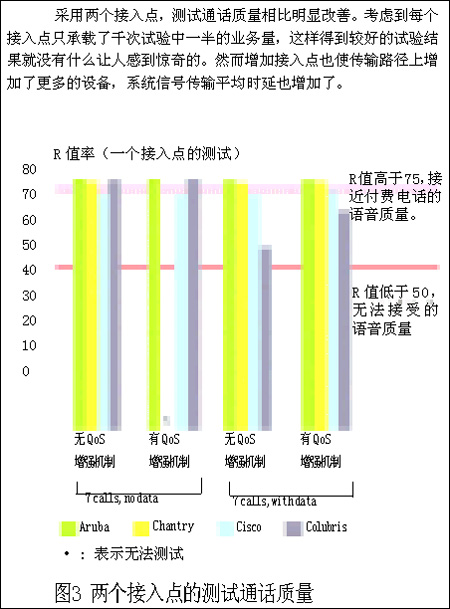 而其他供應(yīng)商的設(shè)備在開啟QoS保障機(jī)制的情況下,一旦加入數(shù)據(jù)流業(yè)務(wù),就很難保證通話質(zhì)量。從正面來看,在只有語音傳輸業(yè)務(wù)的情況下,QoS保障機(jī)制一般運(yùn)行較好。當(dāng)我們只承載語音傳輸時(shí),所有系統(tǒng)的音頻質(zhì)量都改善了。在不加入數(shù)據(jù)流情況下測(cè)試6個(gè)或7個(gè)并行VoIP呼叫,所有的系統(tǒng)都能夠取得和付費(fèi)電話一樣的通話質(zhì)量。但當(dāng)我們加入數(shù)據(jù)流業(yè)務(wù),一切都改變了。在承載6個(gè)并行VoIP呼叫并加入數(shù)據(jù)流業(yè)務(wù)的情況下,Colubris CN1250系統(tǒng)的R值衰落到70以下。根據(jù)ITU的R值標(biāo)準(zhǔn),這說明一些用戶的通話質(zhì)量不令人滿意。Chanrty的R值在60左右,這個(gè)結(jié)果將不能令用戶滿意。除了客觀的R值評(píng)分以外,我們還進(jìn)行了一些主觀的通信質(zhì)量監(jiān)聽,當(dāng)加入了數(shù)據(jù)流業(yè)務(wù)以后,我們聽到了大量的回聲,掉線頻繁?傊,只要測(cè)試點(diǎn)加入數(shù)據(jù)業(yè)務(wù)流,上面描述的情況就會(huì)出現(xiàn),通話質(zhì)量通常變得惡劣。