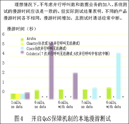 但我們這樣做是合理的。首先,Chantry和Colubris的設(shè)備甚至在建議內(nèi)的6個(gè)并行VoIP呼叫情況下,也無法正常通話。第二,Aruba的設(shè)備能夠處理7個(gè)并行VoIP呼叫并能適應(yīng)加入數(shù)據(jù)流業(yè)務(wù)的情況。第三,我們最有難度的試驗(yàn)也遠(yuǎn)低于無線傳輸媒介的最大負(fù)載。我們?cè)囼?yàn)通常低于3Mbps的通信傳輸速度(包括試驗(yàn)中的所有語音和數(shù)據(jù)業(yè)務(wù)),更遠(yuǎn)低于無線信道的容量了?傊,VoWLAN系統(tǒng)可以實(shí)現(xiàn)在單接入點(diǎn)承載7個(gè)并行VoIP呼叫并加入數(shù)據(jù)通信業(yè)務(wù),但要做到這一點(diǎn)需要更完善的系統(tǒng)設(shè)計(jì)和產(chǎn)品性能。