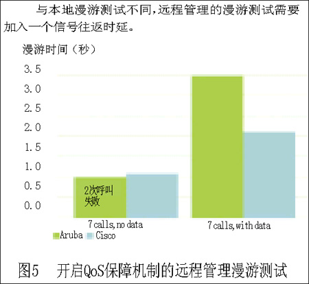 上述操作是為了啟動(dòng)QoS保障機(jī)制后,系統(tǒng)就能取得顯著的成效。但只有Aruba的系統(tǒng)在所有測(cè)試中保持了一貫的良好表現(xiàn),在具有QoS保障機(jī)制的情況下,甚至在最惡劣的情況下(7個(gè)并行VoIP呼叫并加入數(shù)據(jù)流業(yè)務(wù)),它仍然能夠傳送出和付費(fèi)電話通話質(zhì)量一樣的信號(hào)。Aruba的系統(tǒng)在打開QoS增強(qiáng)機(jī)制的情況下,系統(tǒng)承載業(yè)務(wù)最空閑和最繁忙的測(cè)試結(jié)果差別很小。
