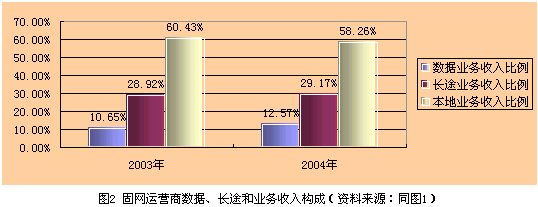 目前數(shù)據(jù)業(yè)務(wù)收入與話音業(yè)務(wù)收入相差懸殊,通過發(fā)展數(shù)據(jù)業(yè)務(wù)彌補VoIP造成的話音收入損失尚需時日。以固網(wǎng)運營商為例,2003年和2004年數(shù)據(jù)業(yè)務(wù)、長途業(yè)務(wù)和本地業(yè)務(wù)收入構(gòu)成見圖2所示。