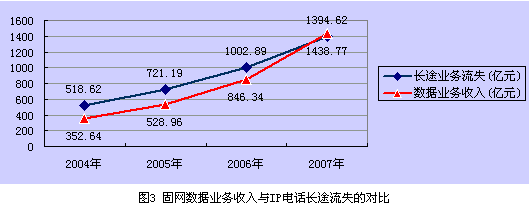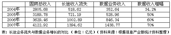 表1 長途業(yè)務(wù)流失與數(shù)據(jù)業(yè)務(wù)增長的對比 (單位:億元)(資料來源:根據(jù)信息產(chǎn)業(yè)部統(tǒng)計資料整理)