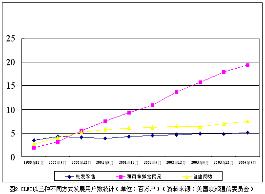 從經(jīng)營模式上看,本地非主導(dǎo)運(yùn)營商的商業(yè)模式在過去的5年中發(fā)生了很大變化。在市場(chǎng)剛剛開始引入競(jìng)爭的1999年,42.9%的本地非主導(dǎo)運(yùn)營商選擇了批發(fā)零售這種進(jìn)入門檻相對(duì)較低的商業(yè)模式,本地電話市場(chǎng)一度活躍著大量地區(qū)性的小運(yùn)營商。由于面臨本地主導(dǎo)運(yùn)營商的強(qiáng)烈抵制,非綁定網(wǎng)元政策的實(shí)施自公布以來一再推遲,經(jīng)過反復(fù)的法律訴訟,美國最高法院在2002年最終裁定非綁定網(wǎng)元政策合法。自那時(shí)起,AT&T、MCI等全國性的長途電話運(yùn)營商紛紛通過租用非綁定網(wǎng)元的方式進(jìn)入本地電話市場(chǎng)。截止到2004年6月,本地主導(dǎo)運(yùn)營商已經(jīng)提供了約2150萬線非綁定本地用戶線給本地非主導(dǎo)運(yùn)營商。CLEC以三種方式發(fā)展用戶的情況如圖2所示。