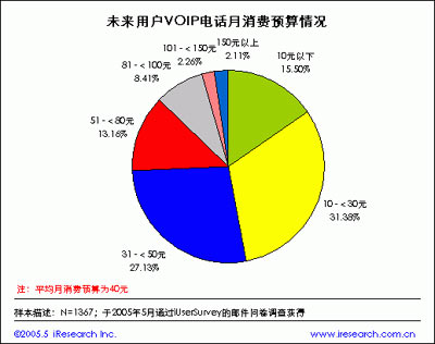 下面再讓我們看看用戶對網(wǎng)絡(luò)電話消費預(yù)算情況,根據(jù)iResearch艾瑞市場咨詢《VOIP報告》數(shù)據(jù)顯示,月消費預(yù)算10元以下的用戶占VOIP用戶的15%,10-30元的占31.3%,31-50元的占27.1%,51-80元的占13.2%,80元以上的占12.8%,據(jù)此計算未來用戶網(wǎng)絡(luò)電話平均月消費預(yù)算為40元。