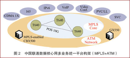 中國聯(lián)通IP電話網(wǎng)的承載網(wǎng)分為核心層和區(qū)域?qū)觾杉壗Y(jié)構(gòu),核心層由北京、上海、廣州、沈陽、武漢、西安和成都7個(gè)大區(qū)節(jié)點(diǎn)組成;區(qū)域?qū)影锤鞣止緟^(qū)域分布情況,劃分為22個(gè)區(qū)域。建網(wǎng)初期,承載網(wǎng)采用ATM+IP/VPN組成IP電話專用傳輸網(wǎng),確保IP承載層的QoS,網(wǎng)絡(luò)性能符合聯(lián)通測試指標(biāo)。下一階段,中國聯(lián)通數(shù)據(jù)核心網(wǎng)的技術(shù)演進(jìn)路線方向如圖2所示。網(wǎng)絡(luò)將以MPLS+ATM為核心技術(shù),在7大核心節(jié)點(diǎn)建設(shè)功能強(qiáng)大的MPLS核心網(wǎng)絡(luò),同時(shí)采用2層MPLS技術(shù),實(shí)現(xiàn)與ATM設(shè)備的透明連接,從而構(gòu)建一個(gè)多協(xié)議、多業(yè)務(wù)同時(shí)兼顧IPv4/IPv6發(fā)展的先進(jìn)網(wǎng)絡(luò)。中國聯(lián)通的互聯(lián)網(wǎng)、數(shù)據(jù)專線、IP電話、視頻會(huì)議、IPv6網(wǎng)絡(luò)、CDMA1X數(shù)據(jù)通信網(wǎng)等都承載在統(tǒng)一的數(shù)據(jù)傳送平臺(tái)之上。