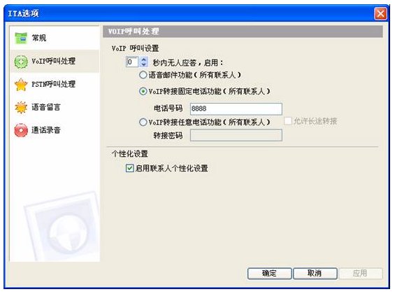 啟動(dòng) VoIP呼叫轉(zhuǎn)接固定電話功能,設(shè)置0秒啟動(dòng),轉(zhuǎn)接固定電話號(hào)碼為交換機(jī)內(nèi)置語音引導(dǎo)號(hào)。如圖,8888是深圳交換機(jī)上配置的語音引導(dǎo)號(hào),直接撥打8888會(huì)聽到“歡迎致電某某公司,請直撥分機(jī)號(hào)碼,查號(hào)請撥
