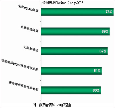 市場調(diào)研咨詢公司Yankee Group日前針對消費者進行了一次調(diào)查,結(jié)果顯示:73%的用戶喜歡VoIP是因為通過它可以進行免費的PC對PC通話;69%的用戶喜歡VoIP在線呼叫的功能;67%的用戶表示,VoIP廉價的通話費用使人們可以無限制地通話,令人心動;61%的用戶表示,喜歡通過VoIP使電話與PC、其他在寬帶網(wǎng)絡上的一些活動捆綁起來;60%的用戶表示被服務提供商提供的優(yōu)惠套餐吸引。對于用戶來說,VoIP最大的吸引力似乎在于其低廉的話費和為人們帶來的方便。