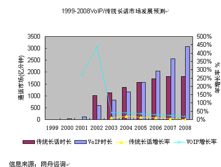 2000年以來,IP長話憑借明顯的資費(fèi)優(yōu)勢,對傳統(tǒng)長話形成了有力的競爭,在通話量上已趕超了傳統(tǒng)長話。也正是由于IP長話的低資費(fèi),在其通話量大幅度增加的同時,也導(dǎo)致了國內(nèi)長話網(wǎng)總體收入的下降,長途電話IP化的趨勢十分明顯?傮w而言,中國VoIP市場仍蘊(yùn)藏著非常大的潛力,按照3G和NGN的部署速度,
