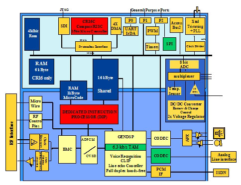 例如,SC14438是一個(gè)優(yōu)化了的CMOS芯片,能夠進(jìn)行DECT(1.9GHz)內(nèi)或2.4GHz ISM數(shù)字頻帶手機(jī)內(nèi)需要的所有音頻、信號(hào)及數(shù)據(jù)處理。一個(gè)ADPCM代碼轉(zhuǎn)換器,一個(gè)低功耗的編解碼器(CODEC)及模擬前端被集成于該芯片中,提供麥克風(fēng)與(動(dòng)態(tài)的)揚(yáng)聲器之間直接的連接。同時(shí)還整合了雙工免提操作。SC14438的設(shè)計(jì)適用于任一無(wú)線產(chǎn)品設(shè)計(jì)。一個(gè)專用的TDMA控制器能夠處理所有的物理層時(shí)隙和無(wú)線控制。美國(guó)國(guó)家半導(dǎo)體公司的標(biāo)準(zhǔn)小型RISC
