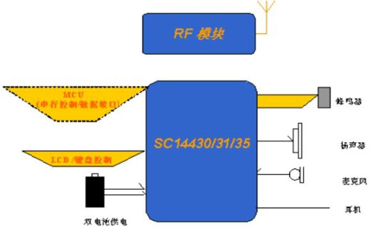 該DECT系統(tǒng)的手機(jī)(HS)部分如圖6所示。手機(jī)部分可以根據(jù)應(yīng)用選擇配置采用獨(dú)立模式或外接MCU的模式工作,方便用戶靈活擴(kuò)展功能。采用獨(dú)立模式工作模式,基帶處理器SC14430/31/35可以實(shí)現(xiàn)對(duì)LCD、鍵盤的控制。外接MCU工作模式是通過(guò)外接MCU的RS232口或SPI口與基帶處理器SC14430/31/35連接,實(shí)現(xiàn)控制/數(shù)據(jù)的交互。