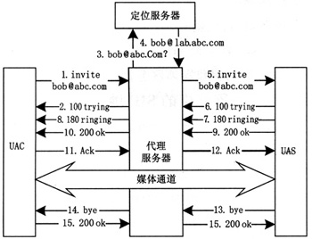 URI地址,建議利用DNS系統(tǒng),解析該地址得到該域中SIP代理服務(wù)器地址,信令到達(dá)該服務(wù)器后,再查詢?cè)撚蛑械奈恢玫怯浄⻊?wù)器,即可定位到被叫用戶當(dāng)前所在地址。