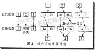 如果某個(gè)RTP包在傳輸過(guò)程中丟失,那么丟失的只是原數(shù)據(jù)包按采樣間隔的一半信息,接收端可以用接受到的另一半信息,利用插值等方法恢復(fù)出原話音包的大部分信息,從而使話音質(zhì)量不至于下降太多。拆分法的主要思想如圖4所示。