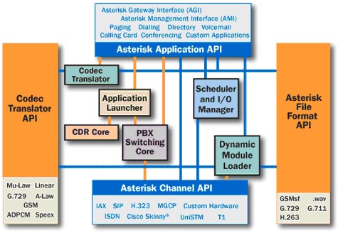Asterisk具有傳統(tǒng)PBX無法比擬的優(yōu)點(diǎn),那就是其靈活性,可擴(kuò)展能力;Asterisk的擴(kuò)展能力是通過開放相應(yīng)的架構(gòu)和接口來實現(xiàn)的。這就意味著Asterisk是一個組件而不是一個成型的產(chǎn)品,Asterisk的核心提供了一個基本的可運(yùn)行環(huán)境,而外圍相應(yīng)的能力則可以通過加載和配置相關(guān)的插件和模塊來實現(xiàn)。