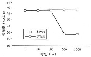 kbit/s降為19.36 kbit/s。然而,對于GTalk其傳輸率則沒有明顯變化。由圖6可知,在時(shí)延為1 ms、10