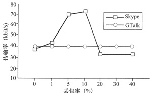 MOS分?jǐn)?shù)的下降。另一方面,Skype在有較高時(shí),傳輸率有明顯的下降,導(dǎo)致業(yè)務(wù)質(zhì)量更糟。